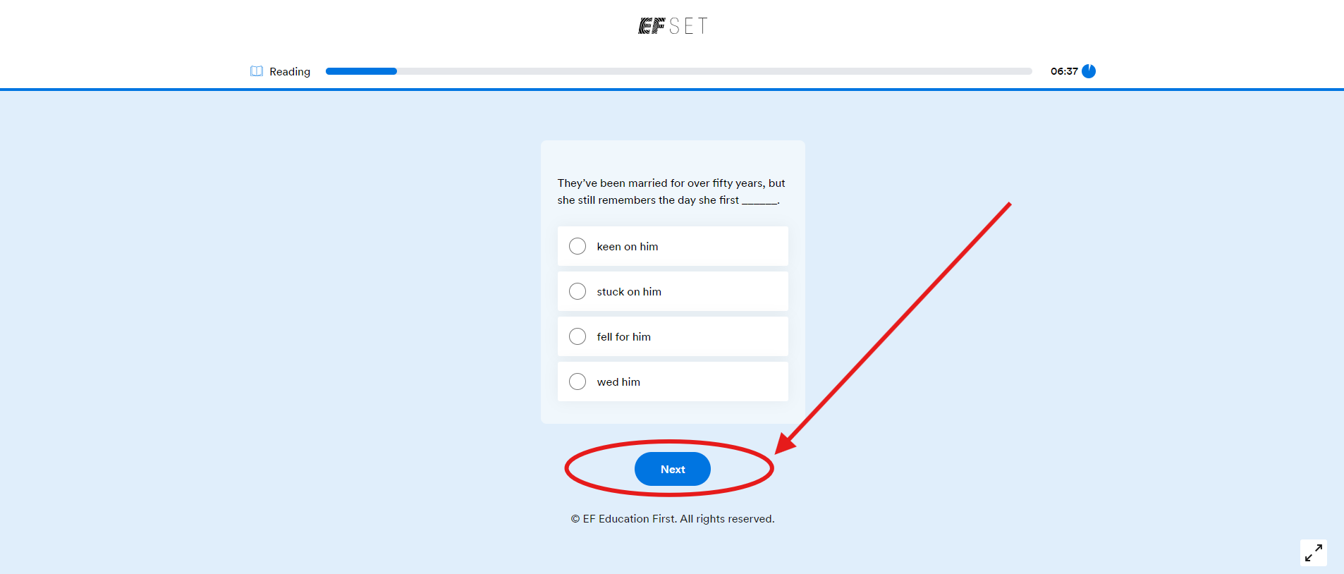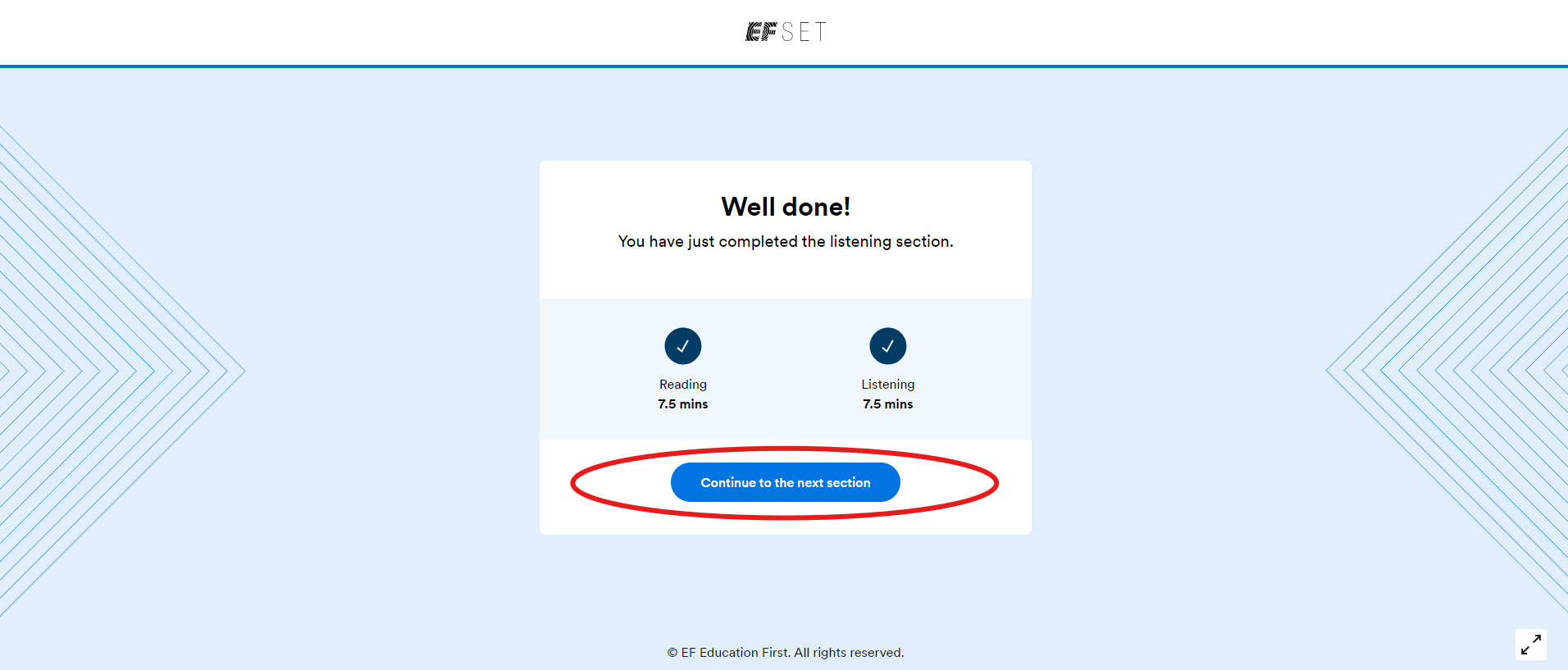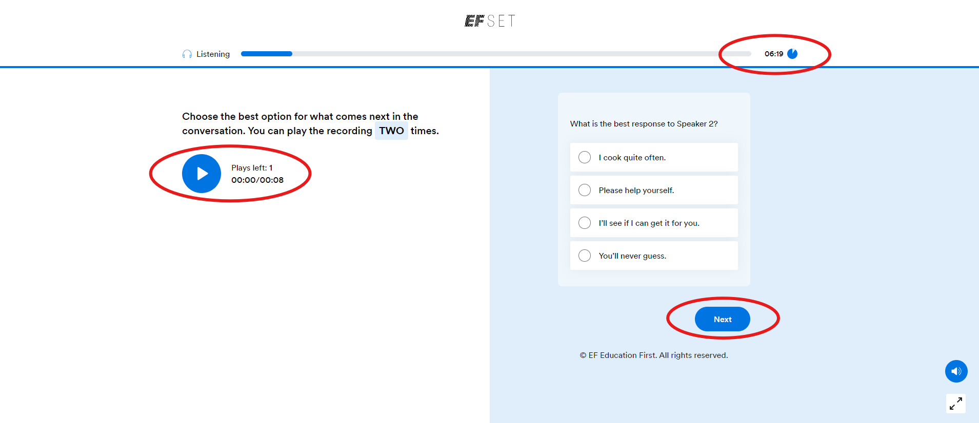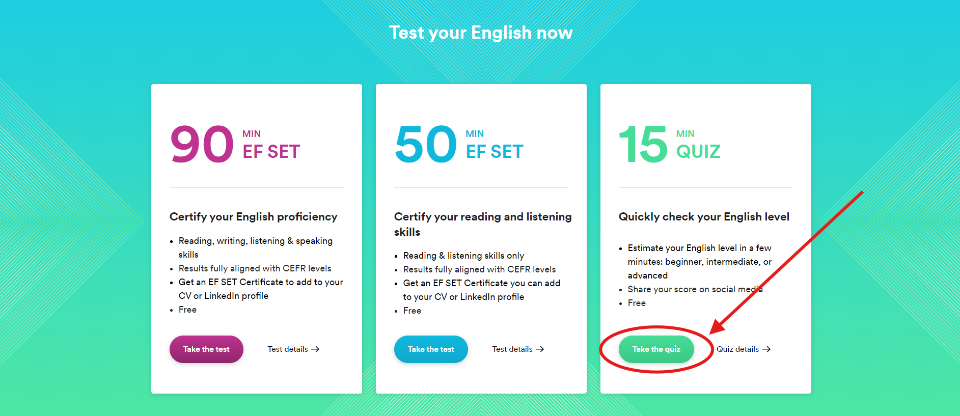 EfSet’te üç farklı ücretsiz İngilizce seviye testi bulunuyor. Kurslarımıza kayıt olmak için 15 dakikalık seviye testi yeterlidir. Detaylı tarama için 90 ve 60 dakikalık testleri yapabilirsiniz ancak bu testleri zorunlu tutmuyoruz.