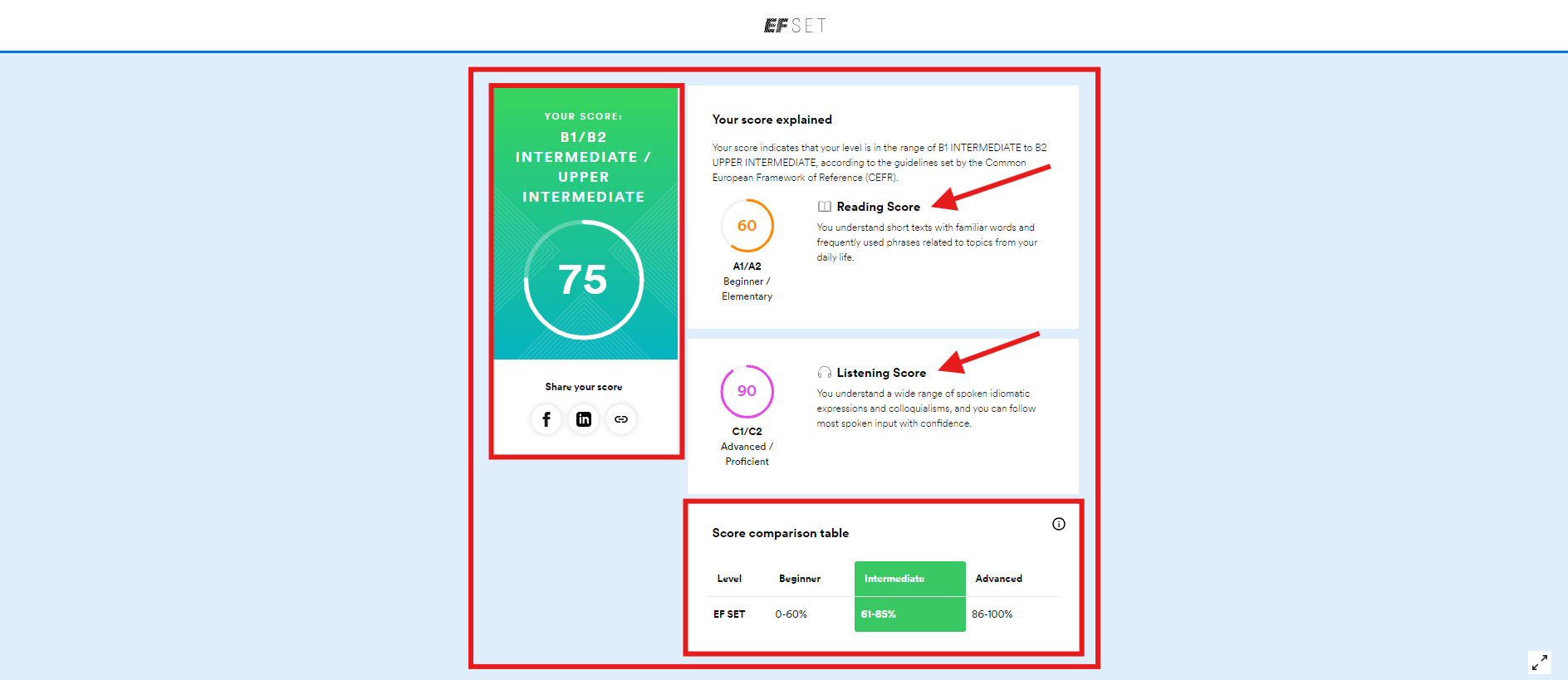 Bu sayfadaki okuma ve dinleme testlerinin yüzdelik dilimleri seviyenizin belirlenmesi için hayati önem taşır. Ekran görüntüsü almayı unutursanız testi tekrar yapabilirsiniz.